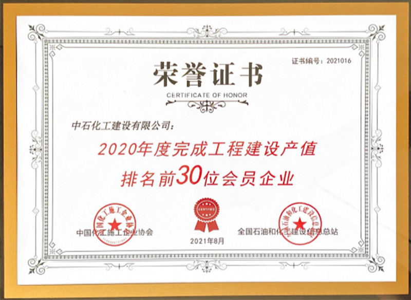 我公司在中國化工施工企業(yè)協(xié)會及全國石油和化工建設信息總站2020年度完成工程建設產值排名中位列第16名。