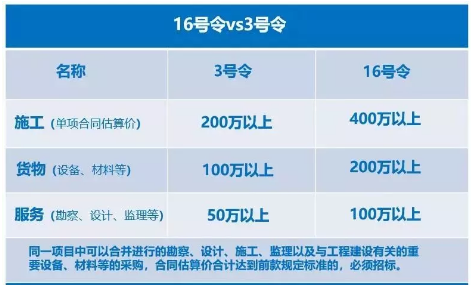 16號令刪除了原3號令中“省、自治區(qū)、直轄市人民政府根據(jù)實際情況,可以規(guī)定本地區(qū)必須進行招標的具體范圍和規(guī)模標準,但不得縮小本規(guī)定確定的必須進行招標的范圍”的規(guī)定,明確全國適用統(tǒng)一規(guī)則,各地不得另行調(diào)整。